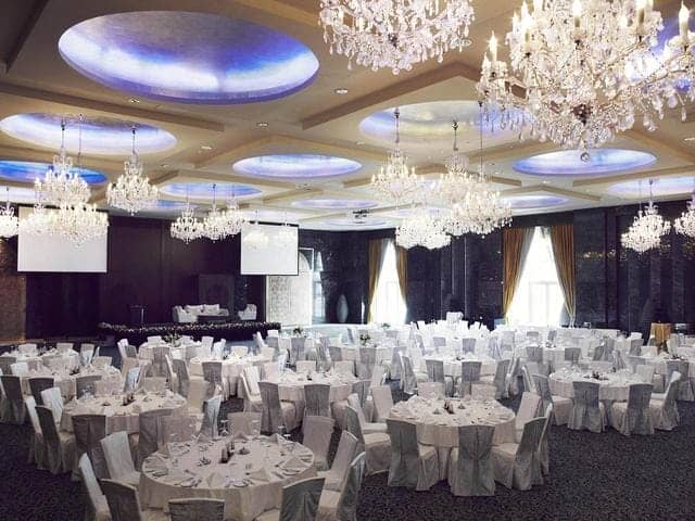 (3)酒店婚宴區(qū):假如這是酒店的主要的經(jīng)濟體系,那就可以將裝飾燈具充分發(fā)揮在這些地方,利用好這些裝飾品位新人增添整體的氛圍。婚宴區(qū)同樣在高度上還是有要求的太矮顯得壓抑,空間的大小決定桌椅的擺放量,解決方法可以采用隔斷的方案。