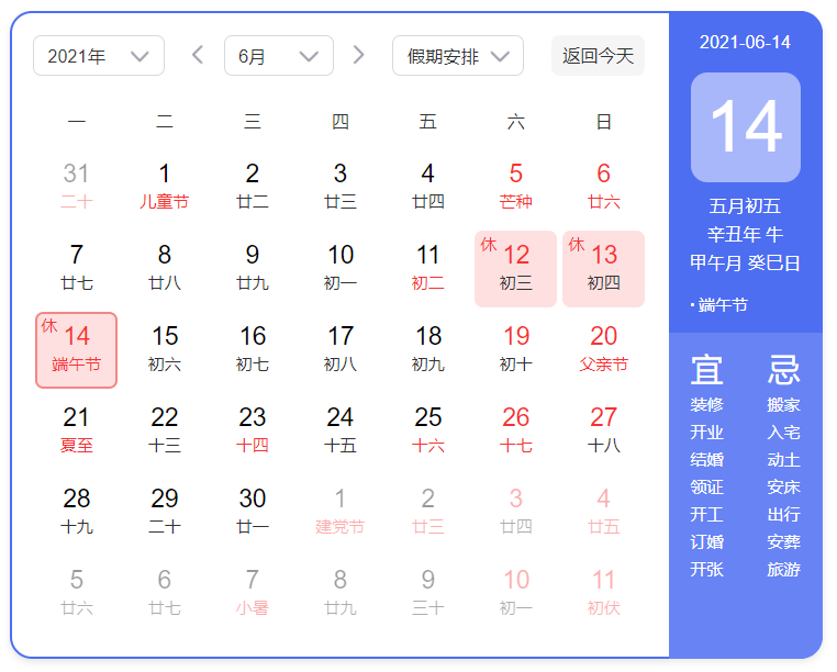 2021年端午節(jié)放假三天,分別是6月12日、6月13日和6月14日,其中6月12日和6月13日分別為周六和周日。 十四日是端午節(jié),恰逢星期一。