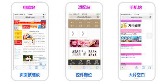 網(wǎng)站打開后,整個(gè)頁面的內(nèi)容被完全縮放在手機(jī)屏幕上,需要不斷地拉伸滑動(dòng)才能瀏覽網(wǎng)頁;一些網(wǎng)站還會(huì)出現(xiàn)左側(cè)擠滿內(nèi)容,右側(cè)卻留出大片空白,部分頁面上出現(xiàn)的控件錯(cuò)亂,造成整個(gè)頁面的不協(xié)調(diào)。